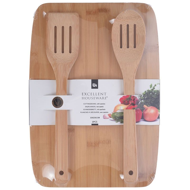 Deze snijplank biedt je een werkoppervlak van 33 x 23 cm en is gemaakt van bamboe. Een bamboe snijplank beschadigt je mes niet en neemt nauwelijks vocht op. Je ontvangt er 2 handige bamboe spatels bij.