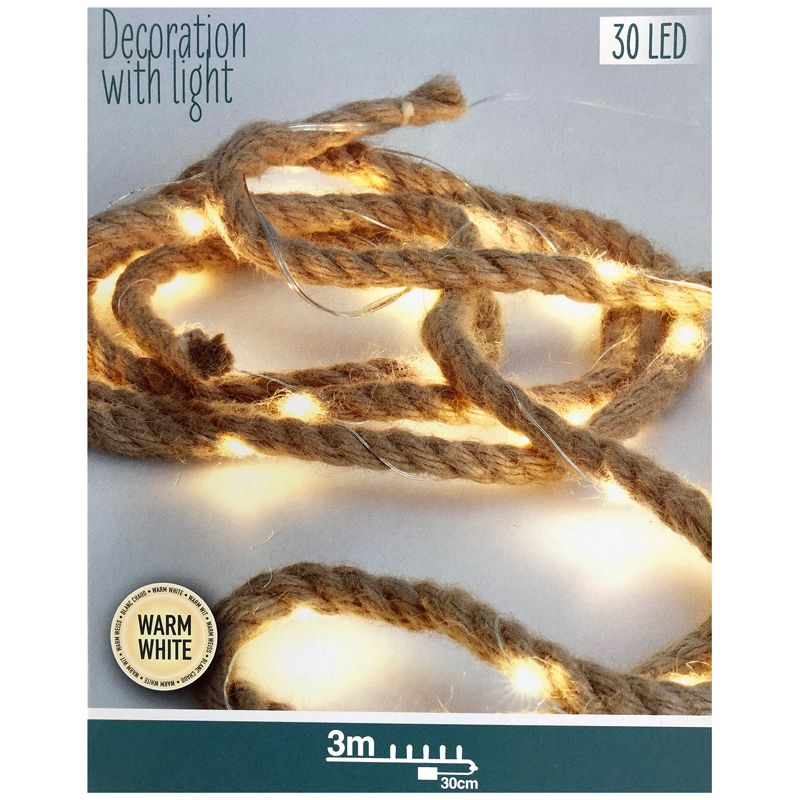 • Het jute touw heeft 30 LED lampjes en heeft een lengte van 300 cm en een aansluitsnoer van 30 cm