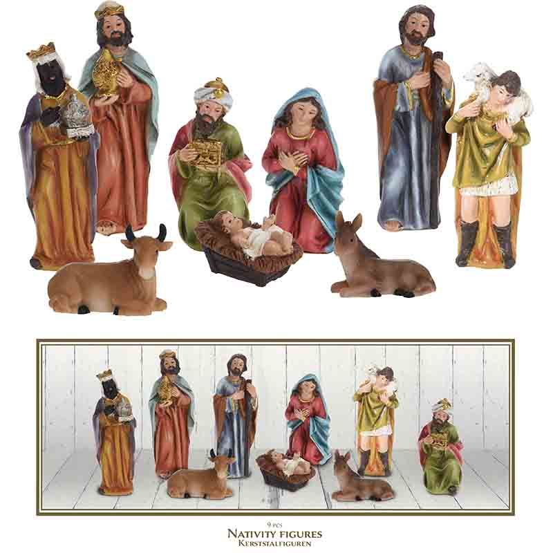 Complete kerstgroep van 9 kerstfiguren gemaakt van polystone.